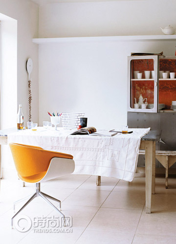 一把極具風(fēng)格的橙色椅子和橙色材質(zhì)的櫥柜使實用的廚房凸顯性格。精致的亞麻提花的舊桌布既遮蓋了有些磨損的桌面又給廚房帶來些許溫和雅致的氣質(zhì)。現(xiàn)在廚房在不做飯時,也可以被用來看書或者思考了。