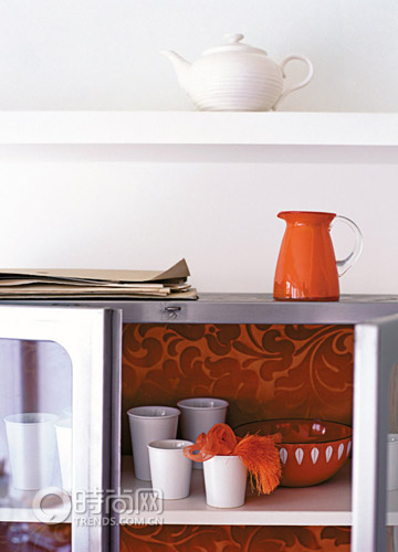 用鮮亮圖案的材質(zhì)或墻紙來重新裝飾櫥柜,這是一個簡單易行的制造沖擊力的方法。用當(dāng)代風(fēng)格的墻紙、壁布,甚至是印刷品都可以,將它們貼在櫥柜里面、柜門上或者干脆就貼在外面。但最好和整個空間的風(fēng)格和色調(diào)相協(xié)調(diào)。