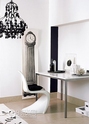 用混搭的風(fēng)格來更新經(jīng)典的黑白搭配。一條簡單的黑色長條色塊增加了角落的深度,本來容易被忽視的角落反而成為了居室里的亮點。其它配飾的選擇除了顏色非黑即白之外,最好選擇不同的材質(zhì)和質(zhì)地,這樣就會有既豐富又單純的效果。