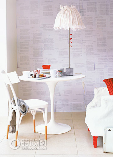 用復(fù)印的文稿裝飾個性墻面。將墻面涂滿膠水,然后粘上文稿。不要過于擔(dān)心是否整齊,不規(guī)則更增添其吸引力,其他的小工藝還包括用彩紙包裹椅子腿,或者在粉刷家具時,故意留下一部分,以及將臺燈的拉繩點綴上紐扣,而選擇紅色靠包可能是最簡單易行的調(diào)色方法了。