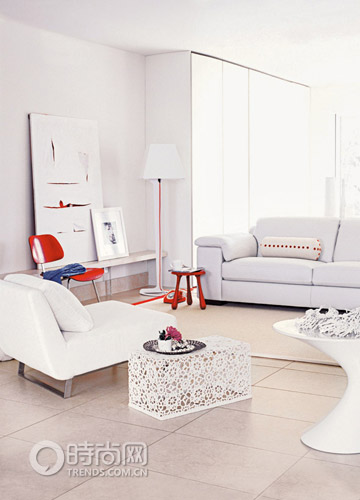 加入一些紅色元素使房間充滿現(xiàn)代感。一把經(jīng)典的餐桌椅,一個詭異的圓凳,一些細(xì)微而別致的鮮紅色裝飾;紅色的電話,話筒卻可以是白色,素色地毯的四邊只有一邊是紅色,白色裝飾畫,用剪開的方式呈現(xiàn)出內(nèi)部的紅色,紅色以不同的方式和形態(tài)出現(xiàn),引人注目卻又不喧賓奪主。