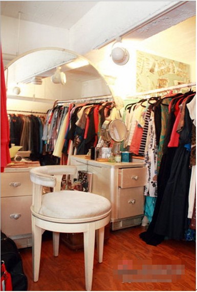 臥室另一頭的梳妝臺(tái),有點(diǎn)復(fù)古味兒。一側(cè)體積龐大的衣帽空間,掛滿了當(dāng)下季節(jié)新潮的衣服,半個(gè)橢圓形的鏡子讓空間狹窄的衣帽間的視覺(jué)空間放大一倍的。