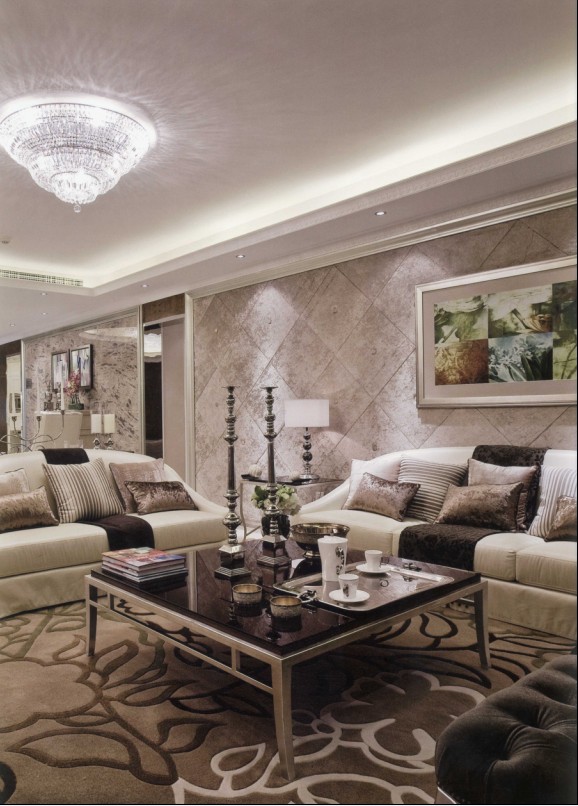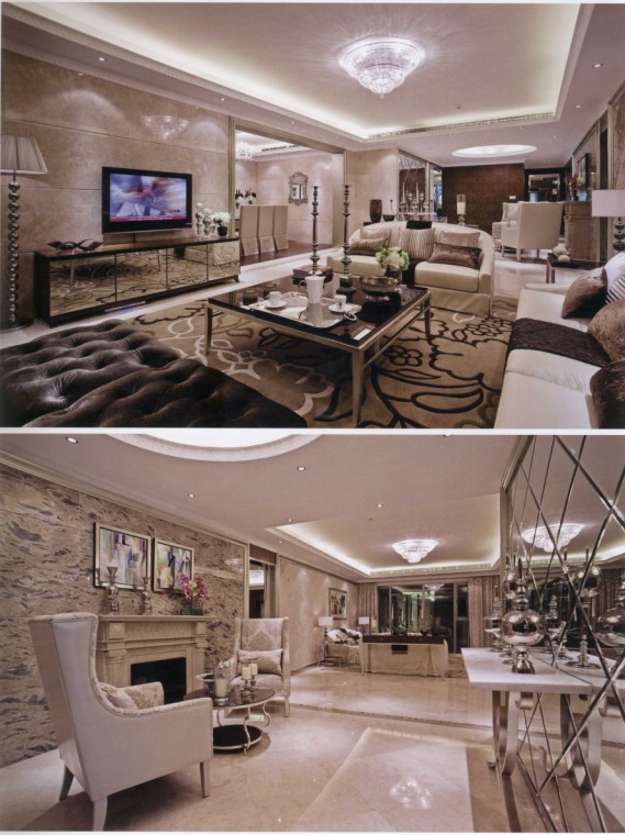 這個客廳空間墻面使用大理石,這幅大圖讓我們看清它細部的雕琢、鑲嵌和鏡面工藝呈現出豐富的視覺效果。家具與施華洛奇水晶吊燈與玻璃飾品精心搭配,似乎連那幅油畫也是無價的。