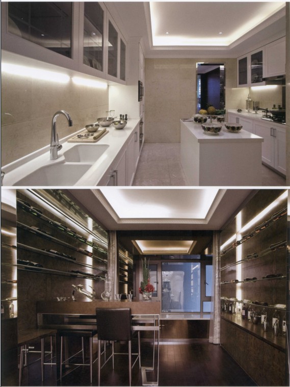 廚房與酒柜吧臺的設計是完全兩種色調,一個過門,一個轉角兩個完全不同的空間。廚房里的簡約色調,酒柜吧臺的深色浪漫都是為生活,為居家而準備著。