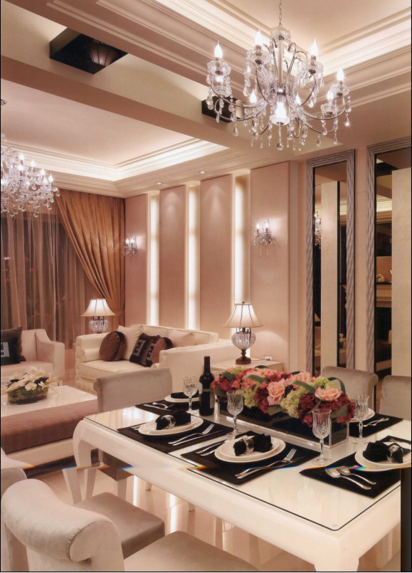 第一感覺是否是層高好高??!這個(gè)直線角度的拍攝可能有一定原因,但它確實(shí)有著令人羨慕的層高在。這是客餐共處的空間,很常見,設(shè)計(jì)師重視空間的開闊及彈性需求,透亮的水晶主燈為空間閃亮開場拉開帷幕。主題餐廳華麗豐富并具層次感,詮釋著輕奢華的表情。
