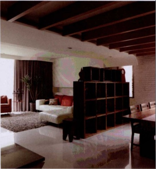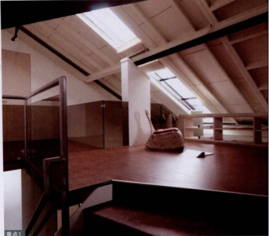 設計師運用開放式空間規(guī)劃,減少木作的使用,以突出挑高、無壓的空間優(yōu)勢,并使用環(huán)何涂料及原木地板等環(huán)保建材,不只在于健康空間的營造,也讓受閱讀的屋主所收藏的書籍有適當?shù)氖占{空間。保留斜屋頂,將挑高的區(qū)域規(guī)劃為閣樓,充分采光的天窗及玻璃扶手隔屏連接書房,滿足了收費也營造了良好的閱讀氛圍。