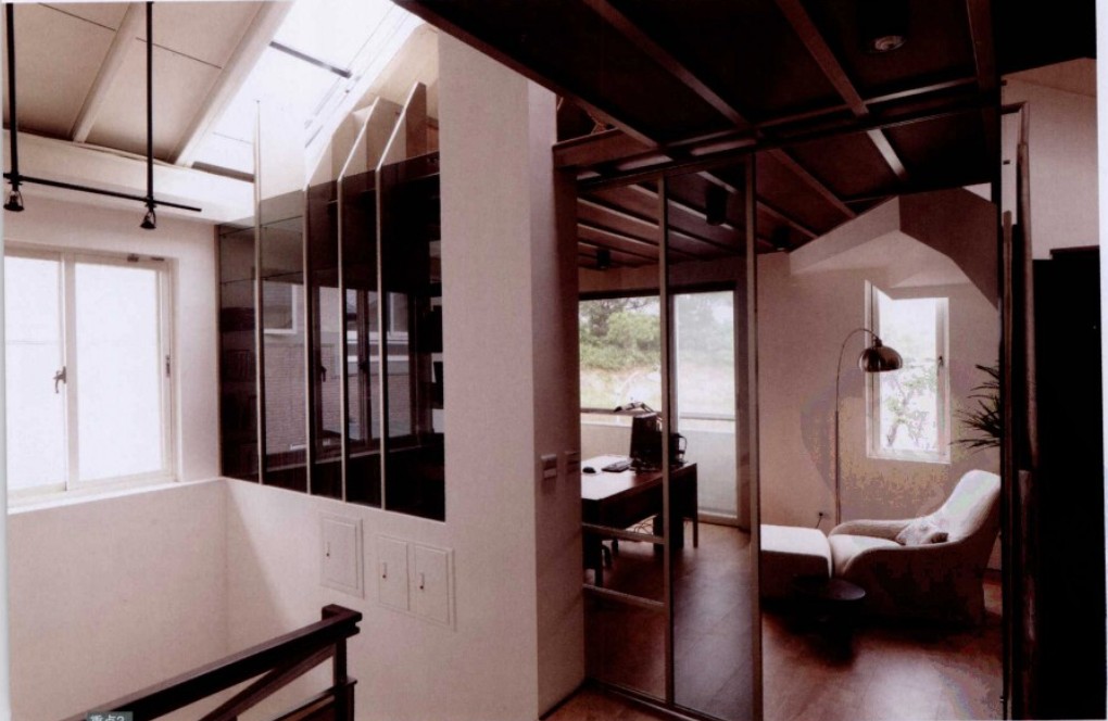 斜屋頂天窗,讓室內自然光線更為充足。將書房規(guī)劃于二樓,特別選擇灰色玻璃作為書房與梯間的隔間,玻璃不僅讓書柜更為輕盈,也讓光線更無所不在。