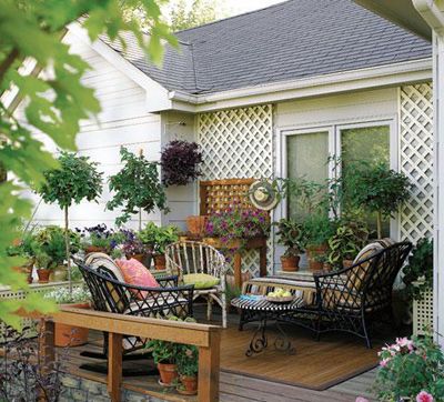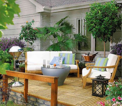 花草:茂盛的盆栽緩和了露臺的氣氛,有助于放松情緒??稍诼杜_邊的花箱里種長春藤,向外延伸的枝條將露臺與花園的景色連接起來。擺放幾株羅勒等香草植物,可以為聚餐提供天然的調味品。