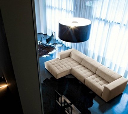 灰色的居室空間,在色調上可能會把客廳顯得比較沉悶,不過設計師巧妙的應用了棱角的規(guī)整元素給房間消除了這種死氣沉沉的感覺。(“棱角”往往是一些比較新的而且感覺容易對人造成傷害的元素,這種元素容易引起人們神經(jīng)的緊張,從而產生防范意識。)