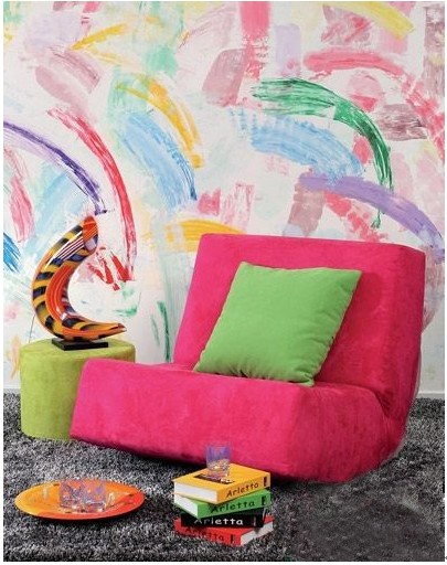 五顏六色的涂鴉墻面,玫紅色單身休閑沙發(fā),綠色靠枕,讓這個(gè)空間變的童真味十足。清新亮麗的玫紅色和草綠色相互搭配,讓整個(gè)沙發(fā)的時(shí)尚感氣息變濃郁,外加上特殊的搖椅式造型,也很受年輕人的喜愛,與五彩斑斕的墻面搭配在一起,顯得溫馨而又自由。