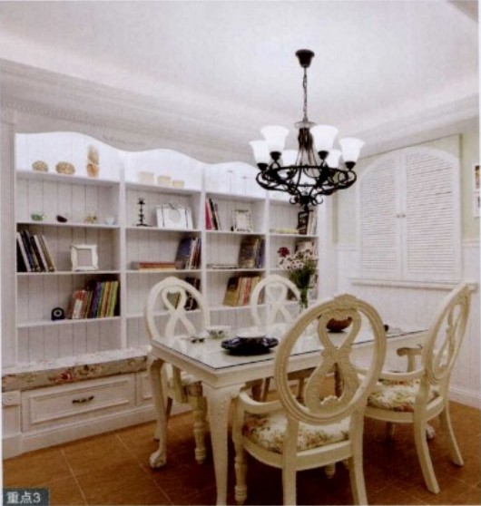 業(yè)主鐘情于美式鄉(xiāng)村風(fēng)格,于是設(shè)計師就將這個四房改成三房,將位于客廳旁的房間拆除,規(guī)劃開放式餐廳與書房,特意選擇古典風(fēng)格中常見的Shutter窗的形式結(jié)合百葉串連空間,讓空間在開闊之余仍具個性風(fēng)格。對于一個愛閱讀的業(yè)主,書籍的擺放收納自然是重點了,設(shè)計師特意將書房與餐廳合并,書柜同時也可以作為餐柜使用,讓家人可以一起用餐、看書。這個似乎有違健康飲食的作法呢。而美式鄉(xiāng)村必備的元素壁爐,也在設(shè)計師的轉(zhuǎn)換下成了電視柜及書柜。無論哪種風(fēng)格,如果想在另一國度里安家,都必須融入這個國度里的生活習(xí)慣。