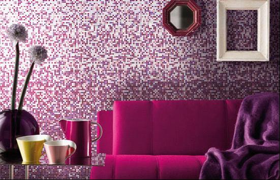 馬賽克一般分為玻璃馬賽克和陶瓷馬賽克,金屬馬賽克就是馬賽克家族中的一種奢飾品了,近視馬賽克也分為三種:一種是在陶瓷馬賽克表面上一層釉,第二種是在其表面粘貼一層金屬膜然后上面再覆蓋上水晶玻璃,第三種則是純金屬做的。當(dāng)然第三種相對(duì)于前面兩種來說價(jià)格是最高的。此圖片中的馬賽克是應(yīng)漸變的手法,從下到上在一色系不變的原則上,由深到淺,逐步漸變上去,整個(gè)空間感覺上也加強(qiáng)了很多。而且相對(duì)于普通沙發(fā)墻而言,它更是變幻奇窮。