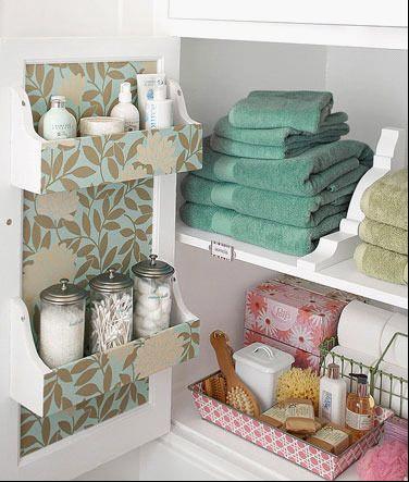 本來浴室的柜子都是放一些很松散的東西,所以,柜門我們可以充分利用。有時(shí)候你買不到現(xiàn)成的時(shí)候,你可以麻煩木工幫你制作一下,在柜門背后做幾個(gè)木質(zhì)的收納架子,把一些洗浴用品放在上面,這樣柜子里看上去也會(huì)整潔的多,并且使用起來也便捷的多。