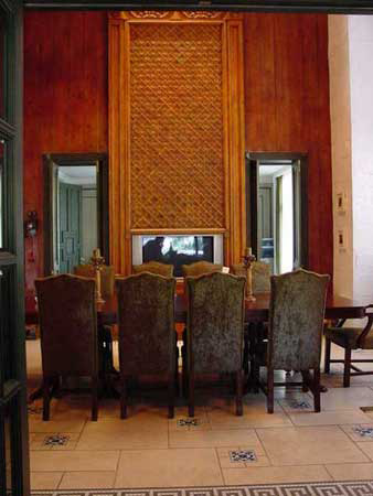 我家里的很多木制的門、書柜、櫥柜都是有呼吸、有生命的。即便有些地方刷上了大綠,別人可能會想綠色很怯,但經(jīng)我處理以后,這個綠是透明的。每一處木頭的顏色都反復做了很多遍,手撫摩的時候非常有質感。有些人看了以后說:´噯,你這不錯,我也學學。´我告訴他們怎么弄的,都回去做了,結果沒一個人做出來是這意思。知道為什么嗎?──偷懶!中國人怕麻煩,各行各業(yè)都想省事。我這個漆反復打磨了7、8次,干了,砂輪磨掉,再用很淡的水彩顏色刷,漆了一個月。可他們5天就干完了,一共才刷了2、3回。工序到不了,不來這效果。要想讓木頭不是´死´的,就要用很豐富的顏色沁在木頭里面,反復摩擦反復吃進去,就像畫油畫一樣,反復畫很多層和你只畫一遍出來的質感是不一樣的。