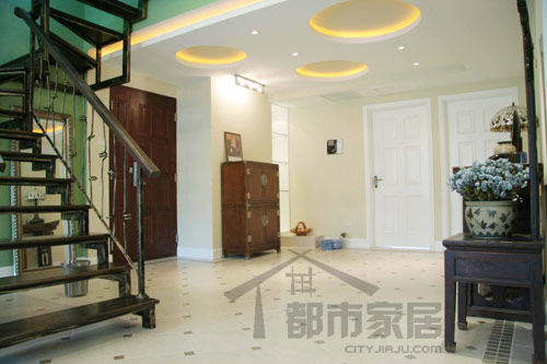 這是初進(jìn)門時(shí)展現(xiàn)在我們眼前的情景。明亮的日光透過紗簾來,整個(gè)房間沒有太多隔斷,感覺上開闊通透極了。左側(cè)的一組中式家居配飾搭配很醒目,紅木條幾、小木柜、瓷盤瓷瓶、老式臺燈以及一把靠背超高的凳子,這租搭配其實(shí)是隨心所欲而為之的,卻顯然成為了別墅入口處最隆重的一角。