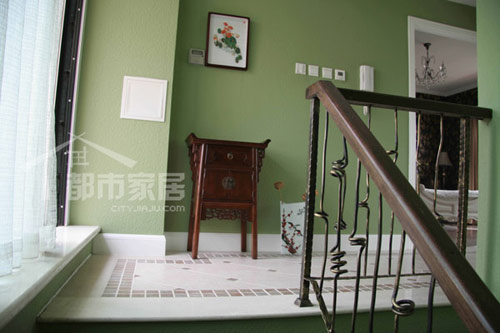 上樓上瞧一瞧去。和別處不同,樓道是泛著灰調(diào)子的綠色空間,柔和而雅致。顏色的運(yùn)用很重要,就拿這綠色來說,它經(jīng)常被運(yùn)用在歐式別墅中,已經(jīng)成為了一種經(jīng)典、正統(tǒng)的搭配。然而太艷會顯得淺薄庸俗,太暗又會顯得陰郁沉悶,拿捏得恰到好處才是設(shè)計(jì)師的功力所在。不看別的,光是這綠色的調(diào)配就能傳達(dá)出房子的源自經(jīng)典的品味。