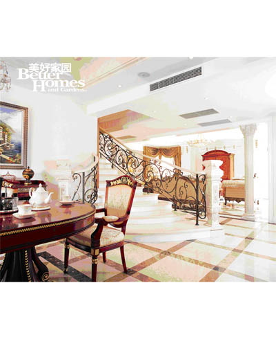 圖5:正常的樓梯踏步高度為16 厘米,設(shè)計(jì)師將其改為12 厘米,降低高度,拉寬踏步,以人為本的設(shè)計(jì),使用更加舒適。將樓梯整體延長,開端的喇叭口設(shè)計(jì)成就大氣尊貴的風(fēng)范。