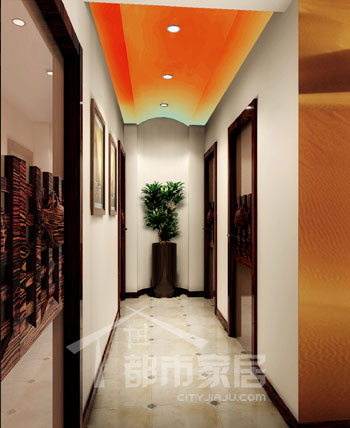 接下來(lái)從客廳步入更加私人的區(qū)域,這就是那個(gè)經(jīng)過(guò)改造后的走廊。吊頂被處理成拱形并涂刷成橘紅色,當(dāng)小編問(wèn)道為什么會(huì)有這樣一種設(shè)計(jì)時(shí),設(shè)計(jì)師表示沒(méi)有特別的意義,只是想讓這道走廊有一種氣貫長(zhǎng)虹的氣勢(shì)。走廊兩邊每道門的腰部有一個(gè)木頭裝飾,原來(lái)是木魚(yú),在設(shè)計(jì)師的精心設(shè)計(jì)下,原本平淡無(wú)奇的走廊也變得生動(dòng)豐富起來(lái)。