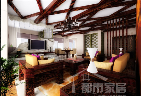 走進(jìn)客廳,一幅綺麗壯觀的異域畫卷展開(kāi)在我們眼前。天花板上縱橫交錯(cuò)的梁像把我們帶進(jìn)了原始叢林一般。橫梁是老榆木的,客廳餐廳的吊頂全是這樣,這部分一共花了八千左右。
