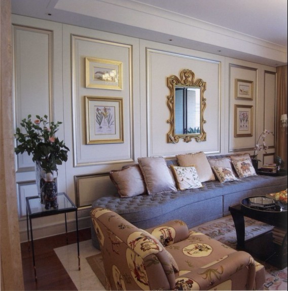 這是一戶高層豪宅,電梯直接入戶。古典主義的裝飾風格讓空個空間充滿了精致、典雅、唯美的氣息。然而,設(shè)計師試圖通過一些材料——銀箔細條的植入,為這個空間增添一些特殊的氣質(zhì)。墻面中嵌入的銀箔細條仿佛是一道清涼的風景,為整體莊重的古典風格憑添了幾分現(xiàn)代時尚的氣息。