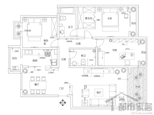 這是改造完成的平面布置圖,能夠看到各功能區(qū)域劃分非常明確。三居室的空間對于一對新婚夫婦來說是足夠用了,考慮到男主人喜歡看書的特點(diǎn),設(shè)計(jì)師建議業(yè)主減少一間臥室,將次臥中的一間改為書房,這樣合理的建議立即得到了業(yè)主的認(rèn)同。