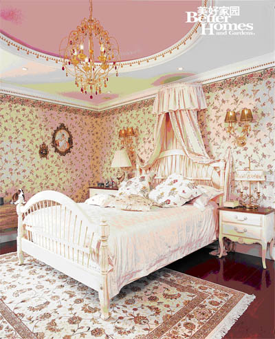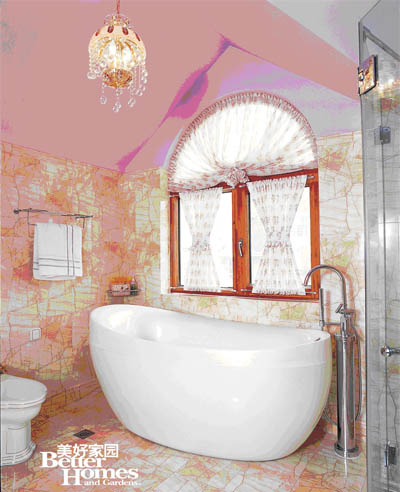 女孩房的衛(wèi)浴間:淺紫色的屋頂相比白色更有柔美感,褶皺的紗簾也別具小女生情調(diào)。獨(dú)立浴缸看起來(lái)有漂浮感,頗具裝飾性,讓其成為注意力的焦點(diǎn),可掩飾衛(wèi)浴間過大帶來(lái)的視覺空曠感。