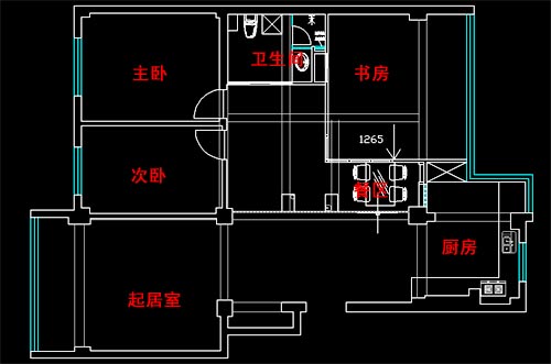 書房右側(cè)陽臺(tái)L型下部空間做到廚房當(dāng)中,從而加大廚房面積。這樣就能擺下業(yè)主鐘愛的一套整體櫥柜了。