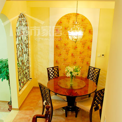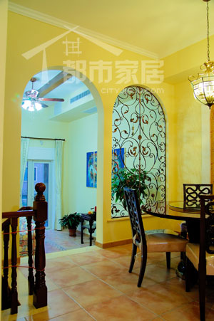 客廳的旁邊踏上幾個臺階就是餐廳,這里也是設計師唯一做了墻體結構改動的地方。大家注意一下圖中左邊的鐵藝拱窗和右邊的拱門,其實原本客廳通往餐廳的門就位于左邊的拱窗處,但后來設計師把原本的門砌成了拱窗,又在拱窗右側新開了一個拱門。這不是有一點多此一舉嗎?我猜大家都有點納悶了。其實這是設計師考慮了風水因素后而做出的改造。從客廳向餐廳看,原本的門(現(xiàn)在的拱窗)就正對著別墅的前門,照片中拱窗隱約露出了半截門。再反過來看看下圖。