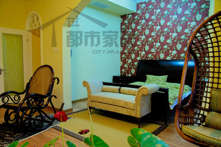 最后我們再來看看樓上主人的臥室吧!果然也是很鮮艷很熱鬧!其實里面的裝修非常簡單,熱鬧的感覺主要來自于床頭墻面上紅色的大花朵壁紙。設計師說:“其實我個人并不建議把臥室里裝點得這么花哨、熱鬧,一般來說臥室適宜安靜、平和。不過主人就是喜歡這樣的風格,所以我選用了這個壁紙。臥室里間的墻保留了白色,外間的墻則和餐廳一樣是暖融融的黃色,這樣顯得空間更有層次感。”