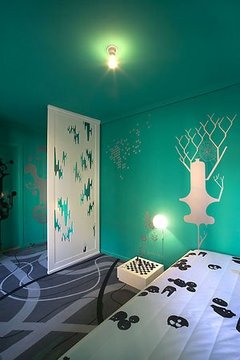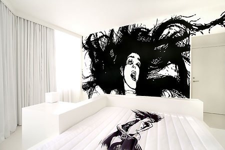 于零五年四月開幕的HotelFox,位于丹麥?zhǔn)锥几绫竟?,它的出現(xiàn)震撼了酒店及涂鴉藝術(shù)界。該酒店邀請了全球十三個(gè)國家,共二十一位著名涂鴉藝術(shù)家、插畫設(shè)計(jì)師,把原本三星級的舊酒店改頭換面,六十一個(gè)房間配以六十一種不同的裝飾設(shè)計(jì),不再是獨(dú)沽一味,充滿年輕活潑感覺。
