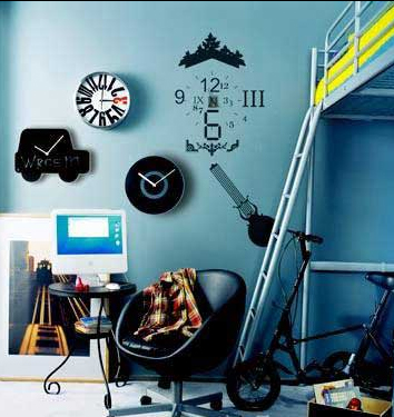 裝飾講究個(gè)性和偏好,把各種各樣的鐘表釘在墻上,灰色的墻面看起來不再呆板,有些童趣的造型,線條簡(jiǎn)單,詼諧有趣,讓人心情愉悅,墻面也變得鮮活起來。