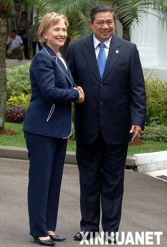 2月19日,在印度尼西亞首都雅加達總統(tǒng)府,印尼總統(tǒng)蘇西洛(右)會見到訪的美國國務(wù)卿希拉里。