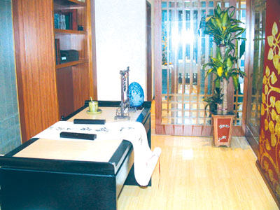 除了梨木,屋里其他深色系的家具均為高貴的檀木??蛷d的茶幾、腳凳和邊幾,還有書房里擺在正中的像案幾一樣的書桌等,都是檀木做成的,造價自然不菲,據(jù)說客廳的茶幾和腳凳就花費好幾萬。但確實沉穩(wěn)內(nèi)斂,有一種特有的含蓄美。