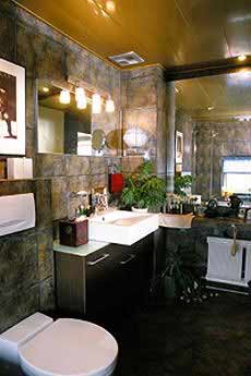 這個(gè)衛(wèi)生間的妙處當(dāng)然就是要你多一點(diǎn)頑皮之心了。不要拘泥什么定式,其實(shí)任何一種材料、任何一種裝飾品在設(shè)計(jì)伊始并沒(méi)有被規(guī)定必須做什么,只要展開(kāi)想象,當(dāng)然就可以獨(dú)一無(wú)二、與眾不同。