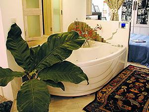 要在一個(gè)四十幾平方米、已經(jīng)幾乎沒(méi)有浴室的小房里享受沐浴的快樂(lè)是不可能的嗎?答案并非全否定,這個(gè)大膽的“浴室”干脆設(shè)在了客廳里,大大的按摩浴缸盤踞了一個(gè)角落,并成為客廳與臥室功能分區(qū)的隔斷。在“浴室”與廚房之間還像模像樣地開(kāi)了個(gè)小窗子,很可愛(ài)。誰(shuí)說(shuō)小就意味著不健全?全看個(gè)人怎么做。
