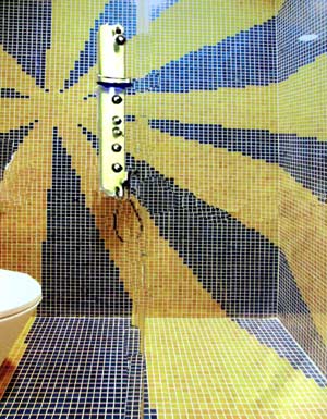 這張劉設(shè)計(jì)師展示給我們的衛(wèi)生間效果圖看起來(lái)實(shí)在夠獨(dú)特。墻面的馬賽克鋪貼得像一朵正在盛開(kāi)的菊花一樣,設(shè)計(jì)師解釋說(shuō):“這就是我的秘訣所在了。張開(kāi)的花瓣造型在視覺(jué)上有極強(qiáng)的擴(kuò)張力,讓我們幾乎感受不到這個(gè)空間的局限和束縛。之所以選用黃色和藍(lán)色也是因?yàn)樗鼈兊膶?duì)比效果比較明顯,能給人明亮潔凈的印象,比較適合衛(wèi)生間?!痹瓉?lái)是這樣啊?大家在欣賞這個(gè)風(fēng)格鮮明、個(gè)性突出的衛(wèi)生間時(shí),是不是忘記了它4平米的真實(shí)大小呢?