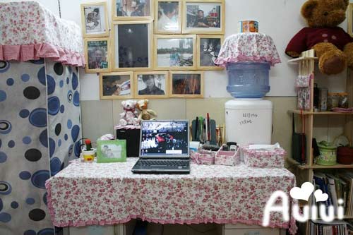 書房,每天上網(wǎng)的地方。左邊是衣柜,右邊是木架。細(xì)心的朋友可以看到餐巾盒、手機(jī)架,都是在淘寶上學(xué)來的,我可是個手工狂。