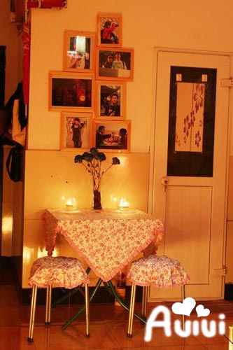 餐廳,無一幸免,所有的東西都穿上了漂亮的小碎花布?;ㄆ坷锏乃{(lán)色妖姬是用紙疊的,上大學(xué)時在風(fēng)信子學(xué)的。嘻嘻,偶爾來個燭光晚餐,屋雖小生活卻也溫馨浪漫。