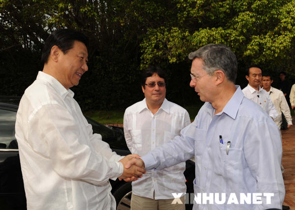 2月15日,正在哥倫比亞訪問的國家副主席***在卡塔赫納會見哥倫比亞總統(tǒng)烏里韋。新華社記者馬占成攝