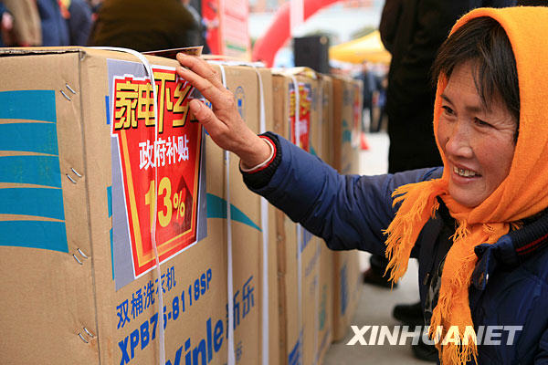農(nóng)民在家電下鄉(xiāng)中購(gòu)買彩電、冰箱等產(chǎn)品,將得到銷售價(jià)格13%的財(cái)政直補(bǔ)。2月1日,江蘇省“家電下鄉(xiāng)”工作正式啟動(dòng)。江蘇省興化市戴南鎮(zhèn)的王巧云來(lái)到鎮(zhèn)上的“家電下鄉(xiāng)”直營(yíng)店選購(gòu)洗衣機(jī)。新華社發(fā) (顧祥忠 攝)
