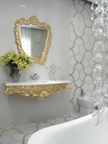 白色的空間配以金色點綴,這樣的復(fù)古搭配使得空間內(nèi)金碧輝煌,鏡框和浴室柜上的雕刻也具有濃重的皇族氣息,高貴的整體空間配以多功能化的衛(wèi)浴設(shè)計是古典的華美與現(xiàn)代的簡約的完美結(jié)合。躺在寬敞的浴缸中透過水霧仰望整個空間,就像自己置身于迷霧中的宮殿一般,亦幻亦真。這是高質(zhì)量生活的一種象征。
