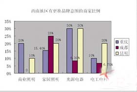 圖表說明:在本次調(diào)查中,參與調(diào)查的商家分別是重慶的45位商家,成都的50位商家,昆明的50名商家。其中成都沒有商業(yè)照明 的商家表示要更換品牌,而重慶和昆明經(jīng)營光源電器的商家要更換品牌的呼聲最強(qiáng)烈,高達(dá)的30%商家表示要更換品牌。