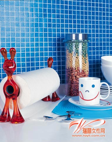 小紅狗拉長(zhǎng)的脊背是個(gè)紙巾架,帶有表情的咖啡杯給飯后小憩帶來(lái)好心情。淡藍(lán)色的膠質(zhì)杯墊與湖藍(lán)色馬賽克的墻面相呼應(yīng)。紙巾架 價(jià)格482元 德國(guó)精品城 咖啡杯套裝 價(jià)格 1275元 德國(guó)精品城