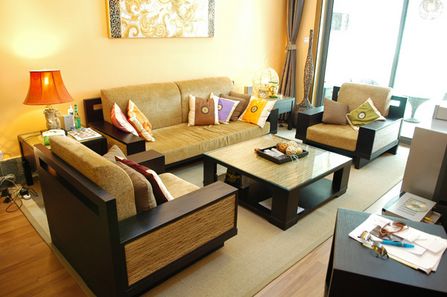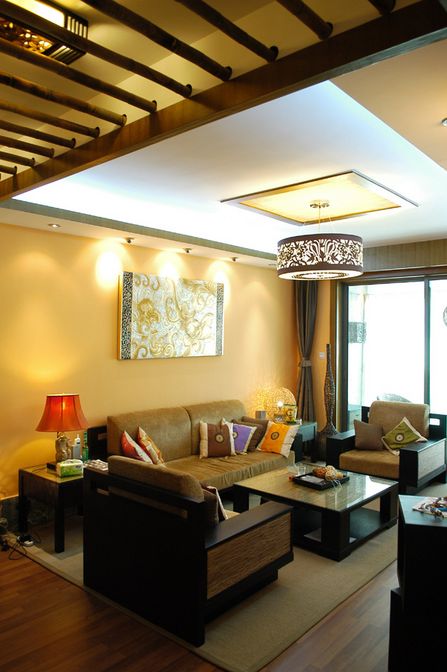 沙發(fā)無(wú)論是色彩還是造型都與整個(gè)房間的風(fēng)格很搭調(diào),莊嚴(yán)高貴的紫檀木配上大氣的黃色布?jí)|,營(yíng)造出古樸內(nèi)斂的氛圍,下面鋪了席子,是懷舊的自然情懷。
