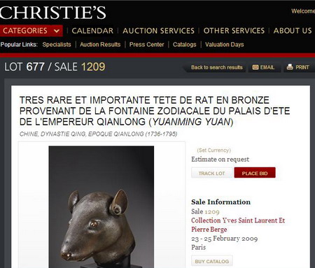 2008年7月,法國佳士得拍賣行發(fā)布公報(bào)宣布,將于2009年2月舉辦“伊夫·圣洛朗與皮埃爾·貝爾熱珍藏”專場拍賣會(huì),鼠首和兔首銅像出現(xiàn)在此次拍賣會(huì)的拍品名錄上,引起各界廣泛關(guān)注。