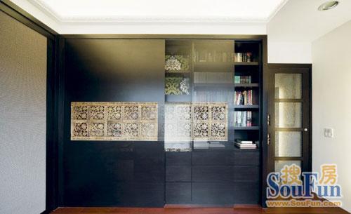 工作間大方時(shí)尚,柜門上的傳統(tǒng)鏤空裝飾彰顯了主人的文化品味。深色空間的凝重被幾處跳色渲染出溫暖氣息。