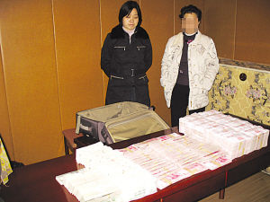 辦案人員在清點(diǎn)贓款(左為潘玉梅)圖片來源:揚(yáng)子晚報(bào)