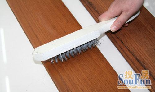 世友:既然是抗刮痕地板,那么我們自然先要做極限耐磨測試。將地板固定好,然后使用鋼絲刷在地板面上使用強力來回磨擦。實驗結(jié)果讓編輯有些意外,原本以為這樣極限的測試多少會有少許刮痕出現(xiàn),但在測試后發(fā)現(xiàn)地板表面沒有留下任何刮痕,表面光滑依舊,絲毫看不出測試的痕跡。]