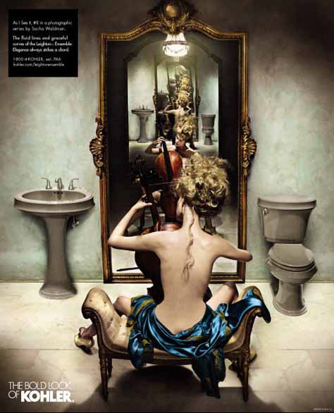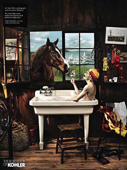 初看Kohler的這幾組雜志廣告,首先是被畫面豐富的故事性所吸引,然后才注意到產(chǎn)品——這與一般廣告突出產(chǎn)品的做法極為不同。同時,與一般強調(diào)產(chǎn)品清潔干凈質(zhì)感的表現(xiàn)方法不同,幾位出色的攝影師戲劇性甚至有點超現(xiàn)實的表現(xiàn)手法也頗讓我吃驚。