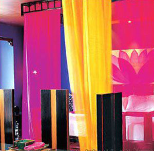 一踏進門,恍若隔世。一個極濃艷的、有蠢蠢欲動的香氣的房間,簡直驚世駭俗:極純的藍、極艷的粉、極亮的明黃,金色的頂,黑色的地,純粹得讓人窒息的色彩,就這么轟轟烈烈地蔓延,和隨處可見的藏式家具一起,把空間裝得滿滿的。加上幽幽暗暗的燈光,曲曲折折的通道……